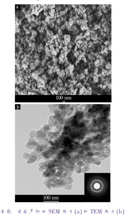 圖6分別為實(shí)驗(yàn)產(chǎn)物的SEM和TEM照片。由圖6a可以看到,粉末為均勻的粒狀產(chǎn)品,無(wú)塊狀產(chǎn)物出現(xiàn)。從圖6b可見,產(chǎn)物為粒狀顆粒,大小尺寸均小于100nm,其SAED圖可看到多個(gè)同心圓的衍射環(huán),說(shuō)明納米磷酸鋅是一結(jié)晶性良好的多晶結(jié)構(gòu)。