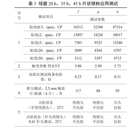 由表3可知,球磨20h、35h片狀銀粉制得IC封裝導(dǎo)電銀膠點膠效果好,無明顯拉膠現(xiàn)象;45h的制得導(dǎo)電銀漿點膠存在尖頭和拉膠現(xiàn)象。同時可以看出,20h的片狀銀粉觸變指數(shù)低,導(dǎo)電銀膠需要有良好觸變特性便于點膠;45h的片狀銀粉觸變指數(shù)高;而且可以看出35h、45h制得的導(dǎo)電膠的線條電阻值較小。這三款產(chǎn)品推力測試、固化后硬度測試、高低溫冷熱沖擊測試及高溫高濕測試均滿足應(yīng)用。綜合上述各項指標(biāo),球磨35h制得的片狀銀粉制得的導(dǎo)電銀膠均達到了應(yīng)用指標(biāo)要求。